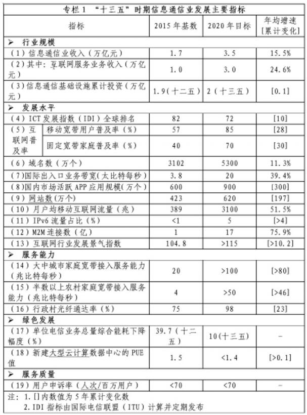 信息通信業(yè)整體規(guī)模進(jìn)一步壯大,到2020年,綜合發(fā)展水平大幅提升,“寬帶中國(guó)”戰(zhàn)略各項(xiàng)目標(biāo)全面實(shí)現(xiàn),基本建成高速、移動(dòng)、安全、泛在的新一代信息基礎(chǔ)設(shè)施,初步形成網(wǎng)絡(luò)化、智能化、服務(wù)化、協(xié)同化的現(xiàn)代互聯(lián)網(wǎng)產(chǎn)業(yè)體系,自主創(chuàng)新能力顯著增強(qiáng),新興業(yè)態(tài)和融合應(yīng)用蓬勃發(fā)展,提速降費(fèi)取得實(shí)效,信息通信業(yè)支撐經(jīng)濟(jì)社會(huì)發(fā)展的能力全面提升,在推動(dòng)經(jīng)濟(jì)提質(zhì)增效和社會(huì)進(jìn)步中的作用更為突出,為建設(shè)網(wǎng)絡(luò)強(qiáng)國(guó)奠定堅(jiān)實(shí)基礎(chǔ)。