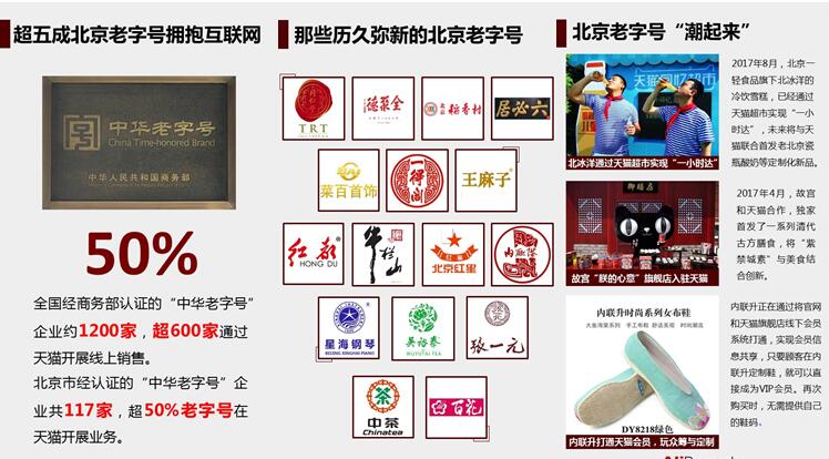 據(jù)研究顯示,全國經(jīng)商務(wù)部認(rèn)證的“中華老字號(hào)”企業(yè)約1200家,超600家通過天貓開展線上銷售。其中,北京市經(jīng)認(rèn)證的“中華老字號(hào)”企業(yè)共117家,超50%老字號(hào)在天貓開展業(yè)務(wù)。2017年前八月,北京老字號(hào)十強(qiáng)企業(yè)的在線銷售超8億元。2016年北京的老字號(hào)電商10強(qiáng)入圍門檻超2000萬元,是2014年電商10強(qiáng)入圍門檻的2.5倍。
