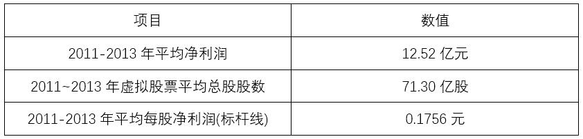 考慮到電力行業(yè)外部環(huán)境因素波動的周期性(如煤價),為盡可能平抑周期性波動,本方案以2011-2013年虛擬股票的平均每股凈利潤為標桿線。