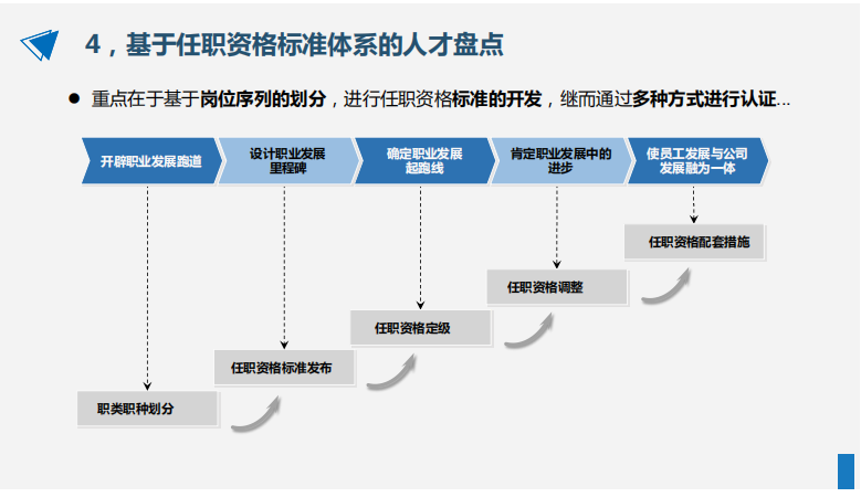 基于任職資格的人才盤點(diǎn),強(qiáng)調(diào)基于崗位/崗位序列的關(guān)鍵職責(zé)進(jìn)行知識、技能、能力、素質(zhì)、業(yè)績等綜合資質(zhì)的萃取與評價(jià),更加強(qiáng)調(diào)任職者綜合資質(zhì)與所承擔(dān)的職責(zé)之間的業(yè)務(wù)關(guān)聯(lián)性。基于任職資格的人才盤點(diǎn),一是有助于對戰(zhàn)略實(shí)現(xiàn)所需要的能力進(jìn)行超前規(guī)劃;二是有助于知識萃取,將存在于少數(shù)員工心中、腦中的技能轉(zhuǎn)化為組織智商,促進(jìn)“學(xué)習(xí)型組織”的建設(shè);三是有助于人才復(fù)制,即根據(jù)公司的知識地圖、能力地圖,批量生產(chǎn)人才,在人才管理的整個(gè)鏈條中占有主動權(quán)。