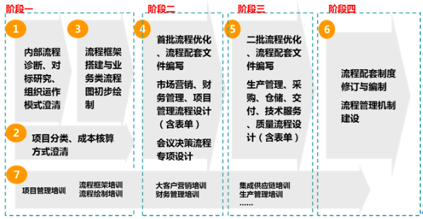 第二階段:主要為首批流程優(yōu)化、流程配套文件編寫,包含市場營銷、財務(wù)管理、項目管理流程設(shè)計(含表單)、會議決策流程專項設(shè)計。