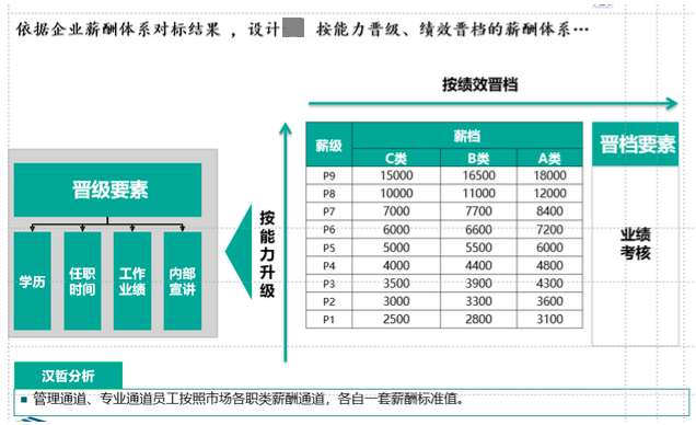 1、對標(biāo)典型互聯(lián)網(wǎng)企業(yè)薪酬模式及薪酬結(jié)構(gòu)。研究分析阿里、騰訊、百度、華為四家公司的薪酬模式及薪酬結(jié)構(gòu),結(jié)合公司實際情況,對員工能力進行評估,按照能力晉級,績效進檔的方式設(shè)計能力薪酬體系,構(gòu)建公司自己特點的薪酬體系。
