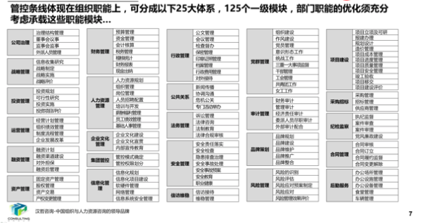 在集團組織結構優(yōu)化與崗位“三定”優(yōu)化過程中,通過分析集團總部現(xiàn)承載的職能模塊并梳理各部門現(xiàn)有職能,結合企業(yè)實際需要,對職能模塊進行了調(diào)整,避免多部門承載同職能模塊導致的職能邊界不清晰的情況。