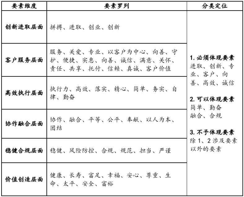 文化要素主輔邏輯定位重點是在諸多已經(jīng)提煉的文化要素基礎上,對文化要素的提及頻次、重要程度、要素邏輯關(guān)系進行標記和初步判定。明確哪些要素是核心要素,哪些要素是輔助要素;明確哪些必須要體現(xiàn)的,哪些要素是可能會體現(xiàn)的,哪些要素是沒必要體現(xiàn)的。這一過程,實際上是對已經(jīng)提煉的文化要素進行的二次篩選和定位,為后續(xù)的文化理念建設提供輸入信息準備。