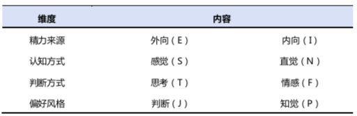MBTI測驗(邁爾斯-布里格斯類型指標)是美國心理學家伊莎貝爾·布里格斯·邁爾斯和凱瑟琳·庫克·布里格斯制定。MBTI測驗從精力來源、認知方式、信息判斷方式、偏好風格四個維度對人格進行測量和評定。精力來源分為外向和和內向,認知方式分為感覺和直覺,判斷方式分為思維和情感,偏好風格分為判斷和知覺,通過這四個維度的組合,從而形成人的人格類型。