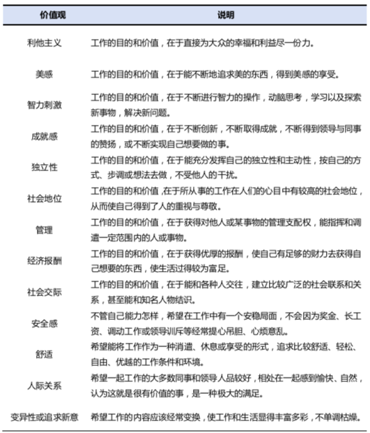 動機是激發(fā)和維持個體的行動,并將行動導向某一目標的心理傾向或內部驅力。通常動機指人的興趣、意志、價值觀等。在人才測評中,常見的動機測驗有職業(yè)價值觀測驗(WVI)。職業(yè)價值觀測驗量表將職業(yè)價值分為三個維度:一是內在價值觀,即與職業(yè)本身性質有關的因素;二是外在價值觀,即與職業(yè)性質有關的外部因素;三是外在報酬,共計13個因素:利他主義,美感,智力刺激,成就感,獨立性,社會地位,管理,經濟報酬,社會交際,安全感,舒適,人際關系,變異性或追求新意。