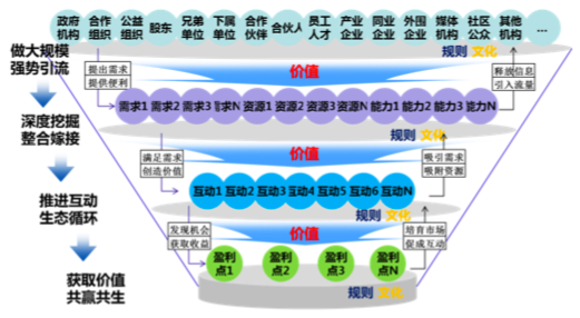 共贏:共贏是平臺(tái)化運(yùn)行的前提,只有平臺(tái)參與者借助平臺(tái)能夠滿足所需,獲得收益,平臺(tái)才具有粘性。同時(shí),共贏也是平臺(tái)化運(yùn)行的結(jié)果,平臺(tái)構(gòu)建了一個(gè)多邊市場(chǎng),各主體在市場(chǎng)交易,創(chuàng)造價(jià)值,促成平臺(tái)的繁榮,平臺(tái)制造者及各伙伴將會(huì)共享市場(chǎng)繁榮帶來的收益。