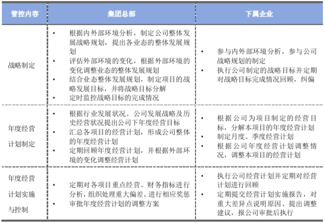 以下為運(yùn)營管控模式下集團(tuán)和下屬企業(yè)戰(zhàn)略經(jīng)營管控權(quán)的權(quán)限界定示例: