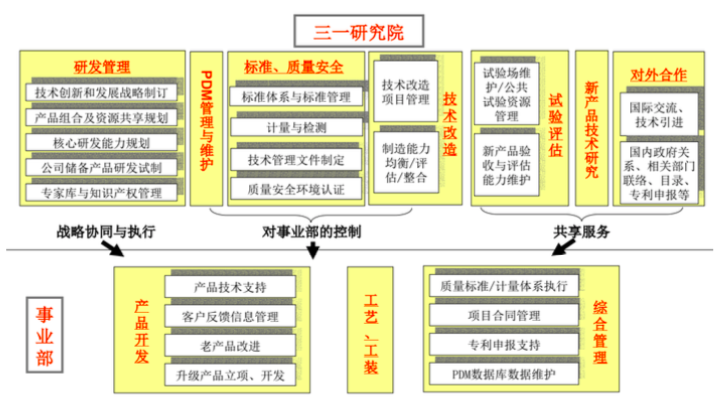 核心模式是事業(yè)部和專業(yè)公司架構(gòu)下的“三級(jí)營(yíng)銷+兩級(jí)研發(fā)”的方式,這一模式下:一是生產(chǎn)制造職能全部由事業(yè)部承擔(dān);二是營(yíng)銷為三級(jí)管理,總部有營(yíng)銷本部,事業(yè)部有營(yíng)銷公司、營(yíng)銷公司下設(shè)營(yíng)銷部,同時(shí)營(yíng)銷承擔(dān)市場(chǎng)、服務(wù)、銷售等綜合職能;事業(yè)部營(yíng)銷會(huì)根據(jù)需要分設(shè)區(qū)域組織進(jìn)行營(yíng)銷;三是研發(fā)分為兩級(jí),一級(jí)是總部研究院,承擔(dān)了新技術(shù)研究,標(biāo)準(zhǔn)制定,研發(fā)、技改、試驗(yàn)評(píng)估等前沿性、通用性、探索性等研究任務(wù);二級(jí)是事業(yè)部研究院,承擔(dān)了產(chǎn)品工藝改良,以及商務(wù)或服務(wù)支持等職能。二級(jí)管理角色明確,使得研究力量得到了很好的分配和使用。