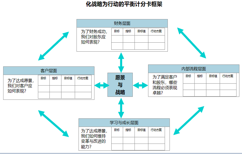 “卡”即是平衡計分卡,平衡計分卡用來衡量企業(yè)的戰(zhàn)略,通過為戰(zhàn)略地圖中的戰(zhàn)略目標(biāo)找到衡量的指標(biāo),能更有效的監(jiān)控戰(zhàn)略實施的情況。