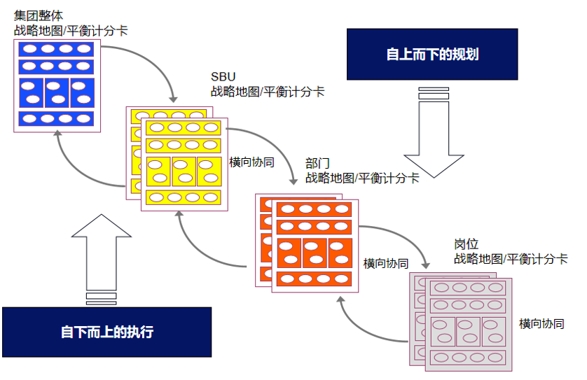 集團化組織的BSC體系開發(fā)應(yīng)從上而上,層層推進(jìn),首先進(jìn)行集團整體的戰(zhàn)略地圖/平衡計分卡開發(fā),然后在集團BSC體系開發(fā)完成后進(jìn)行各SBU(子公司,戰(zhàn)略經(jīng)營/業(yè)務(wù)單位)的開發(fā),最后進(jìn)行各部門的BSC開發(fā)。通過BSC的自上而下的開發(fā),最終確保集團與集團下屬各級組織戰(zhàn)略方向與目標(biāo)的一致。