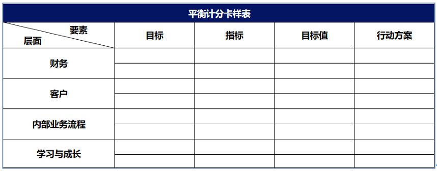 每個層面下結(jié)構(gòu)化模式:戰(zhàn)略目標(biāo)、評價指標(biāo)、目標(biāo)值、行動方案。