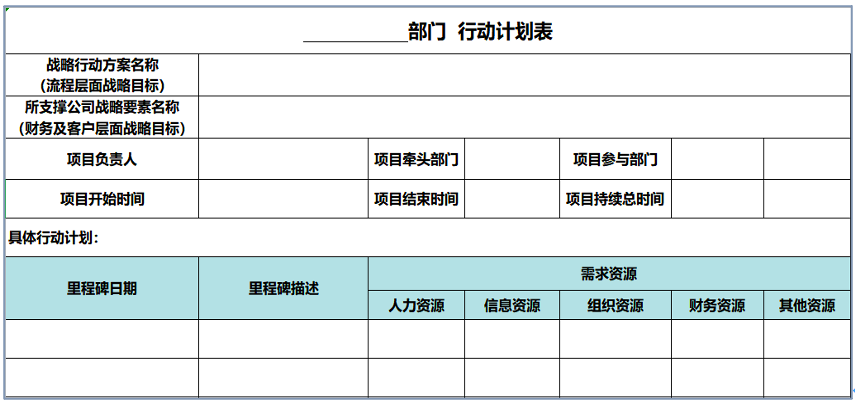 “表”即是戰(zhàn)略行動計劃表,戰(zhàn)略行動計劃表用來落實企業(yè)的戰(zhàn)略,通過對平衡計分表明確的關(guān)鍵舉措制定戰(zhàn)略行動計劃表,明確戰(zhàn)略舉措的推進(jìn)步驟、時間節(jié)點與責(zé)任人,以加強戰(zhàn)略舉措實施的計劃性,并為做好監(jiān)控打下基礎(chǔ)。