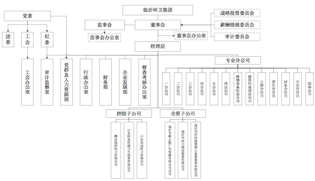 目前,集團(tuán)總部內(nèi)設(shè)辦公室、財務(wù)審計部、黨群及人力資源部、企業(yè)發(fā)展部、工會辦公室、督察考核辦公室、紀(jì)檢監(jiān)察室和環(huán)衛(wèi)綜合服務(wù)中心等8個部室。下設(shè)有一分公司、二分公司、三分公司、四分公司、五分公司、羅莊分公司、河?xùn)|分公司、日照分公司、建筑垃圾清運(yùn)公司、環(huán)衛(wèi)設(shè)備研發(fā)制造維修公司等近20個專業(yè)分公司。