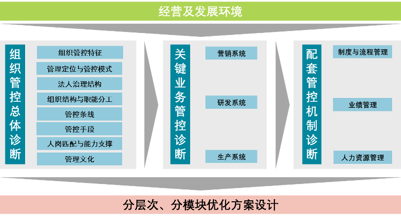首先,基于調(diào)研診斷,明確組織管控問題解決總體步驟及邏輯思路,從方案設(shè)計(jì)和落地實(shí)施雙向推動(dòng)。