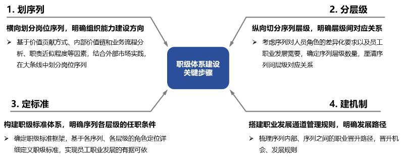 一個(gè)完整的職級(jí)體系建設(shè)項(xiàng)目,應(yīng)主要包括“劃序列-分層級(jí)-定標(biāo)準(zhǔn)-建機(jī)制”四個(gè)操作步驟。下面筆者擬從上述四個(gè)關(guān)鍵步驟入手,結(jié)合項(xiàng)目實(shí)踐經(jīng)驗(yàn),對(duì)上述問(wèn)題進(jìn)行探討。