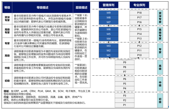 當(dāng)然,除參考市場(chǎng)經(jīng)驗(yàn)外,企業(yè)還需要考慮內(nèi)部實(shí)際情況,尤其是各序列實(shí)際情況來(lái)進(jìn)行層級(jí)劃分。專業(yè)壁壘、戰(zhàn)略重要性差異較大的序列在層級(jí)劃分上也會(huì)有一定區(qū)別。