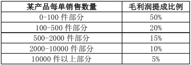 2.產(chǎn)品銷售提成。某產(chǎn)品特性為零售利潤(rùn)率高,但同樣工作量利潤(rùn)總額可能低,公司為拓展零售市場(chǎng),按照超額累退方式設(shè)置提成比例。