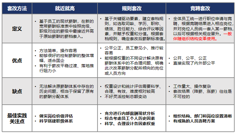 “就近就高”方法的缺點也顯而易見,雖然實現(xiàn)了新舊體系切換,但仍保留了原有薪酬分配邏輯,無法解決原薪酬體系中存在的歷史問題,并將這些歷史遺留問題帶到了新體系。