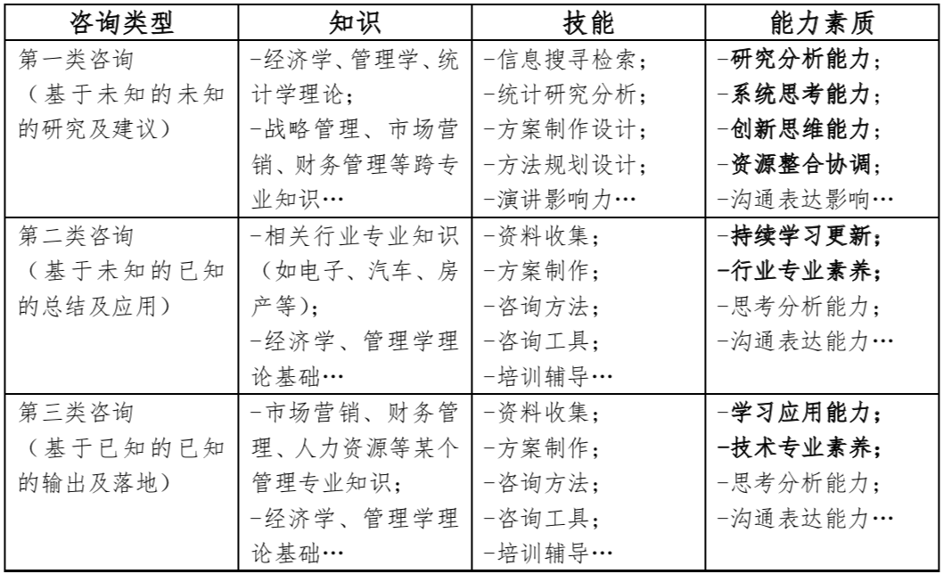 那么,相應(yīng)的咨詢(xún)師在知識(shí)、能力、素質(zhì)上的要求就有區(qū)分了。除了學(xué)習(xí)、思考、分析、總結(jié)、溝通等作為智力工作者的基本要求外,第一類(lèi)咨詢(xún)從業(yè)人員,更強(qiáng)調(diào)高階的研究、系統(tǒng)思維、跨界的融合和客戶(hù)影響力,他們不只是知識(shí)的搬運(yùn)工,更是領(lǐng)域?qū)<液蜕鐣?huì)精英。第二類(lèi)咨詢(xún)從業(yè)人員,更強(qiáng)調(diào)其行業(yè)性,更強(qiáng)調(diào)其所處行業(yè)信息和知識(shí)的領(lǐng)先性以及跨界專(zhuān)業(yè)的融會(huì)貫通,其往往是行業(yè)專(zhuān)家,對(duì)于行業(yè)歷史、動(dòng)態(tài)、標(biāo)桿甚至行業(yè)專(zhuān)業(yè)技術(shù)了如指掌。第三類(lèi)咨詢(xún)從業(yè)人員,更強(qiáng)調(diào)其專(zhuān)業(yè)性,人力資源、會(huì)計(jì)、律法等相關(guān)專(zhuān)業(yè),對(duì)于相關(guān)政策法規(guī)、專(zhuān)業(yè)案例、專(zhuān)業(yè)知識(shí)要求高于客戶(hù)的積累,到了更高階的時(shí)候,對(duì)于跨專(zhuān)業(yè)的知識(shí)掌握也會(huì)有更高的要求。
