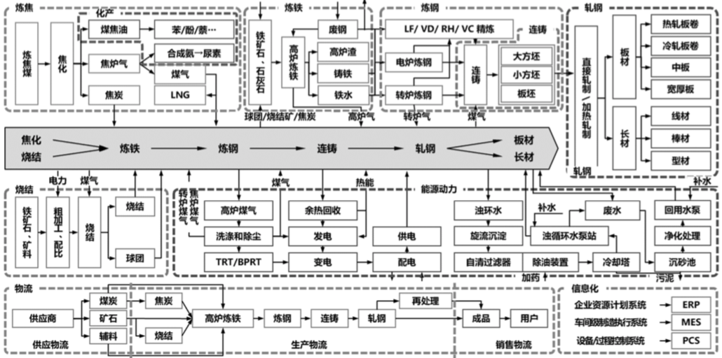一、開展工藝流程梳理分析。不同的鋼鐵企業(yè)具有多種業(yè)務(wù),一些只到煉鐵,一些只從軋制開始。因此,各業(yè)務(wù)間的配合,包括前端產(chǎn)品與后端產(chǎn)品的匹配等,是分析鋼企工藝流程的關(guān)鍵要素。筆者所咨詢的鋼企,由10個(gè)業(yè)務(wù)板塊構(gòu)成的涵蓋全產(chǎn)業(yè)鏈的煉鋼企業(yè)。其工藝流程分析結(jié)果如下圖所示: