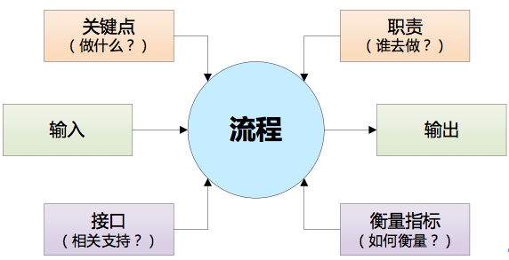 流程不同的定義強(qiáng)調(diào)了不同的要點(diǎn),但歸結(jié)起來可以發(fā)現(xiàn)定義包括了6個要素:具體的輸入、特定的輸出、若干活動、活動之間關(guān)聯(lián)、服務(wù)的客戶、創(chuàng)造的價值。