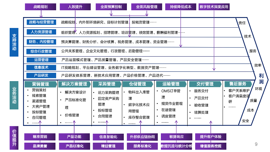 企業(yè)價值鏈梳理是管理體系建設的重要依據,通過將企業(yè)創(chuàng)造價值的活動拆分,識別并強化能夠為企業(yè)帶來競爭優(yōu)勢的戰(zhàn)略活動,建立企業(yè)核心能力,以此來規(guī)劃企業(yè)管理體系的總框架。