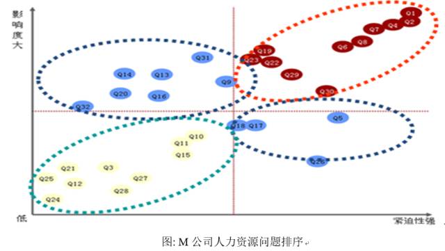 采用“影響度-緊迫性矩陣”,可把上述32個問題分成四個區(qū)間,其中,紅色的問題是影響度、緊迫性都比較大的,是需要首先解決的。