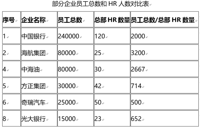 隨著企業(yè)員工總數(shù)的增加,每個(gè)HR人員服務(wù)的員工數(shù)應(yīng)該呈上升趨勢(shì),且企業(yè)規(guī)模越大,上升趨勢(shì)應(yīng)更為明顯。據(jù)有關(guān)研究顯示,HR人員和企業(yè)員工總數(shù)之間的比例有一定的標(biāo)準(zhǔn),下表列舉了部分企業(yè)的實(shí)例。