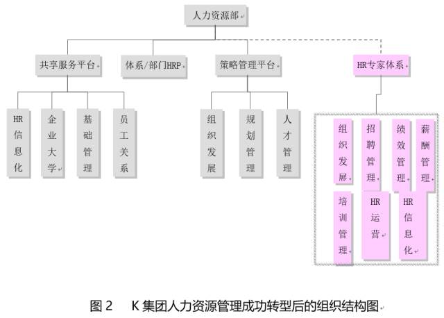 在這個(gè)組織結(jié)構(gòu)圖中,保留了K集團(tuán)人力資源管理的三級(jí)架構(gòu),明確了總部人力資源作為共享服務(wù)平臺(tái)、策略管理平臺(tái)、HR專(zhuān)家體系的三大目標(biāo)。