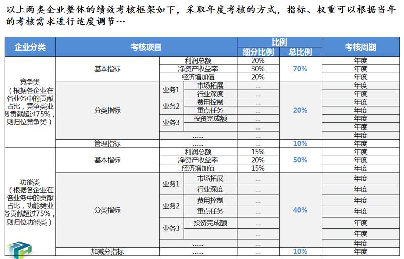 1、優(yōu)化集團(tuán)所屬子公司經(jīng)營(yíng)業(yè)績(jī)考核辦法。根據(jù)集團(tuán)戰(zhàn)略目標(biāo)和所屬子公司的功能定位、業(yè)務(wù)特點(diǎn),實(shí)行年度考核與任期考核相結(jié)合的方式,遵循依法考核、激勵(lì)與約束并重、分類考核的原則,制定子公司考核指標(biāo)、考核程序、考核計(jì)分辦法,形成所屬子公司的經(jīng)營(yíng)業(yè)績(jī)考核辦法,保護(hù)投資人的合法權(quán)益,落實(shí)資產(chǎn)保值增值責(zé)任,建立有效的激勵(lì)和約束機(jī)制,為實(shí)現(xiàn)集團(tuán)戰(zhàn)略目標(biāo)夯實(shí)堅(jiān)實(shí)的基礎(chǔ)。