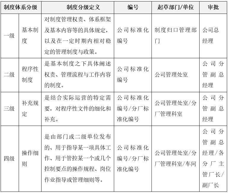 單體企業(yè)制度框架的搭建,要清晰界定制度體系內(nèi)涵,分析內(nèi)外部環(huán)境對制度建設(shè)的影響,在此基礎(chǔ)上,借鑒標(biāo)桿企業(yè)的經(jīng)驗對制度進行分級設(shè)計,同時,基于企業(yè)主業(yè)務(wù)鏈條與支持、管理職能,進行制度的分類設(shè)計,從而形成“縱向到底,橫向到邊”的制度體系框架,作為今后制度體系建設(shè)的基礎(chǔ)。