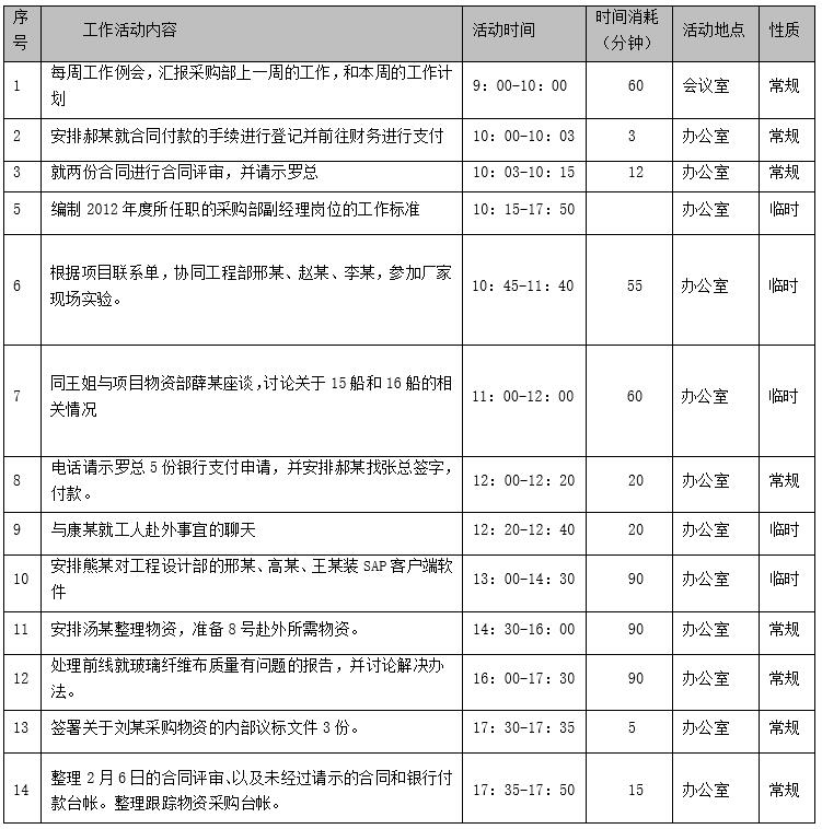 對(duì)于工作量不容易界定的工作,可以采用“工作日志”法核定崗位工時(shí)。所謂“工作日志法”,是指按時(shí)間順序詳細(xì)記錄任職者在一段時(shí)間內(nèi)的工作內(nèi)容與工作過(guò)程,經(jīng)過(guò)歸納、分析,達(dá)到對(duì)崗位的工作內(nèi)容、工作時(shí)間全面了解的一種方法。采用工作日志法定編時(shí),研究人員或者崗位上的任職者需要對(duì)崗位上的人員現(xiàn)場(chǎng)進(jìn)行實(shí)地觀察、記錄,填寫(xiě)“工作日志”。根據(jù)工作日志記錄,可以計(jì)算出每個(gè)崗位的有效工作時(shí)間,從而確定崗位編制情況,一般的標(biāo)準(zhǔn)是,崗位上每天的工作時(shí)間在13.6個(gè)小時(shí)以上者,建議崗位再增加1位專(zhuān)職人員,當(dāng)崗位的有效工作時(shí)間在9.7-13.6小時(shí)的時(shí)候,建議1人專(zhuān)職,另一人兼職;當(dāng)崗位有效工作時(shí)間在5.6-9.6小時(shí)時(shí),建議該崗位定編1人;當(dāng)崗位的有效工作時(shí)間小于5.6人時(shí),建議該崗位由其他人員兼職。