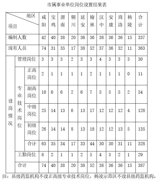 藥監(jiān)系統(tǒng)的事業(yè)單位崗位設(shè)置工作,歷時(shí)半年,全部完成崗位設(shè)置和審批工作,主要結(jié)果如下:96個(gè)事業(yè)單位中,除省屬信息培訓(xùn)中心外,全部確認(rèn)為以專業(yè)技術(shù)人員為主體,管理崗位和工勤技能崗位為輔。全系統(tǒng)共設(shè)崗1252個(gè),其中管理崗位89個(gè),專業(yè)技術(shù)崗位1048個(gè),工勤技能崗位115個(gè)。省、市、縣三級(jí)藥監(jiān)機(jī)構(gòu)各類崗位具體分布情況見下表: