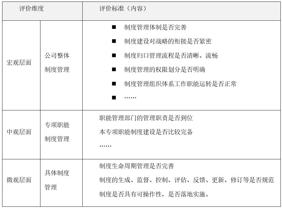 對于制度管理體系的評估,通常從宏觀管理(企業(yè)總體制度管理)、中觀管理(專項(xiàng)職能制度管理)和微觀管理(單體制度管理)三個層面進(jìn)行分類評估,每個層面評估工作的側(cè)重點(diǎn)不同,其中: