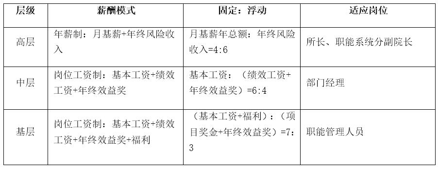 根據(jù)管理層級(jí)高低與承擔(dān)的責(zé)任輕重,薪酬收入中的固定部分(基本工資)和浮動(dòng)工資(項(xiàng)目獎(jiǎng)金、年終效益獎(jiǎng))的分配比例進(jìn)行不同設(shè)置: