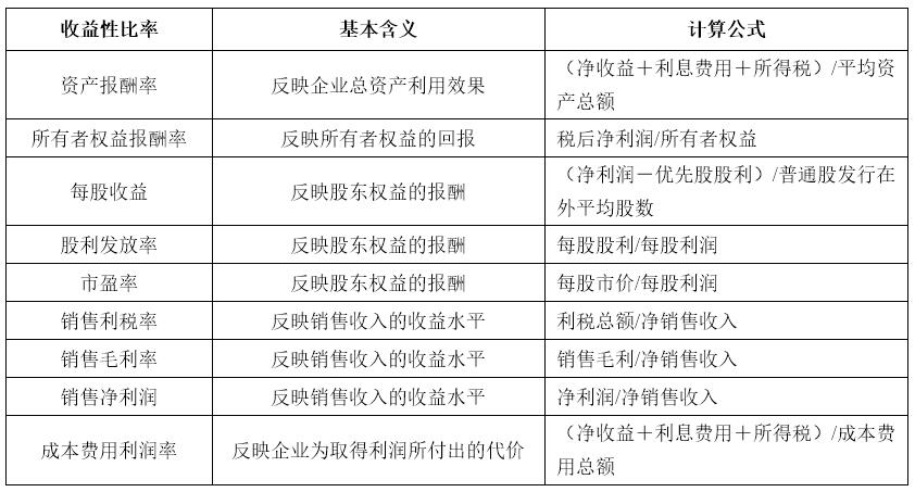 收益性指標(biāo)分析的目的是觀察企業(yè)一定時(shí)期內(nèi)的收益及獲利能力,其主要指標(biāo)的含義及計(jì)算公式如表1所示。