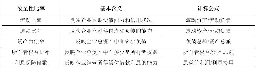 安全性指標(biāo)是指企業(yè)經(jīng)營的安全程度,即資金調(diào)度的安全性,分析安全性指標(biāo)的目的在于觀察企業(yè)一定時(shí)期內(nèi)的償債能力,其主要指標(biāo)的含義及計(jì)算公式如表2所示。