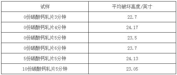 2.軋片的時間決定塑化度的高低,從上述試驗得出,5分鐘以后塑化度基本不變,所以制品的落錘沖擊性能基本不變,軋片4分鐘制品的落錘沖擊性能最好,添加碳酸鈣5份的效果跟不添加碳酸鈣塑化4分鐘的效果相當,10分碳酸鈣的效果跟0份碳酸鈣塑化5分鐘相當。
