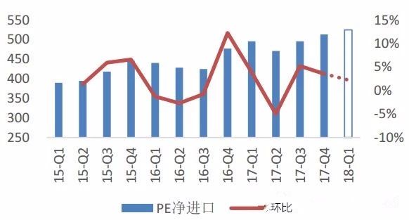 數(shù)據(jù)顯示,中國(guó)聚乙烯進(jìn)口依存度在40-45%左右,進(jìn)口依賴度較高。2018年1月份聚乙烯進(jìn)口128.9萬(wàn)噸,環(huán)比增加17%。2月份由于春節(jié)假期因素進(jìn)口量下降明顯,但3月份從遠(yuǎn)洋貨物的到港情況來(lái)看,進(jìn)口量仍存較高預(yù)期。