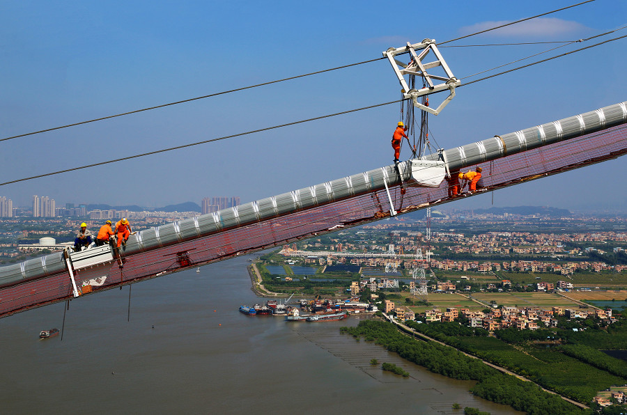 在大沙水道,193米高的東塔從江面直沖云霄。項(xiàng)目施工方相關(guān)負(fù)責(zé)人介紹:“主塔共分41節(jié),每節(jié)精度誤差不超過10毫米。受廣東炎熱天氣的影響,測(cè)量監(jiān)控和混凝土澆筑一般都在晚上進(jìn)行。”如果把橋梁比作一桿秤,錨碇就相當(dāng)于秤砣,橋梁的荷載主要由橋兩端的秤砣來(lái)承受。在東錨碇施工中,施工方用了5900噸鋼筋,混凝土澆筑方量18.6萬(wàn)方,相當(dāng)于62個(gè)標(biāo)準(zhǔn)游泳池,重量達(dá)到46.5萬(wàn)噸,經(jīng)過無(wú)數(shù)次的模板搭建和澆筑才完成。