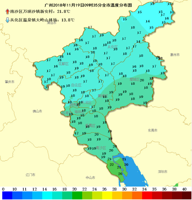 20日,粵北偏北市縣陰天有小雨,其余市縣陰天間多云有輕霧,局部有小雨;氣溫小幅回升。最低氣溫:粵北偏北市縣12℃~14℃,南部沿海市縣19℃~23℃,其余市縣15℃~18℃。
