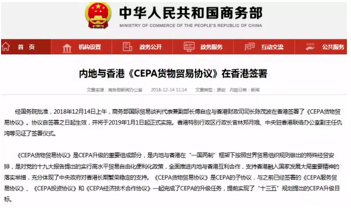 經(jīng)國務(wù)院批準(zhǔn),2018年12月14日上午,商務(wù)部國際貿(mào)易談判代表兼副部長(zhǎng)傅自應(yīng)與香港財(cái)政司司長(zhǎng)陳茂波在香港簽署了《CEPA貨物貿(mào)易協(xié)議》。