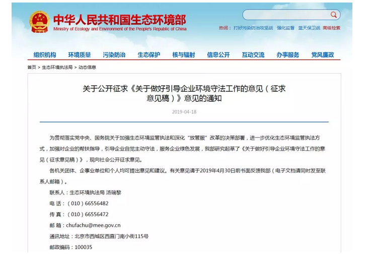 近日,生態(tài)環(huán)境部辦公廳印發(fā)通知,向社會公開征求《關(guān)于做好引導(dǎo)企業(yè)環(huán)境守法工作的意見(征求意見稿)》意見?!兑庖姟访鞔_要求,建立單位內(nèi)部“首接責任制”,對行政相對人實行有關(guān)事項“一次性告知”;對一般違法行為慎用查封、扣押等措施,嚴格禁止“一律頂格處罰”“一律關(guān)?!薄跋韧T僬f”等簡單粗暴行為。