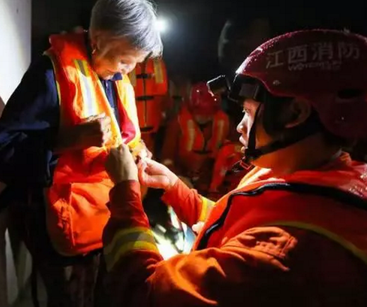 文章標題:—江西吉安連日暴雨成災房屋進水及群眾被困等,消防救援人員救出被困村民