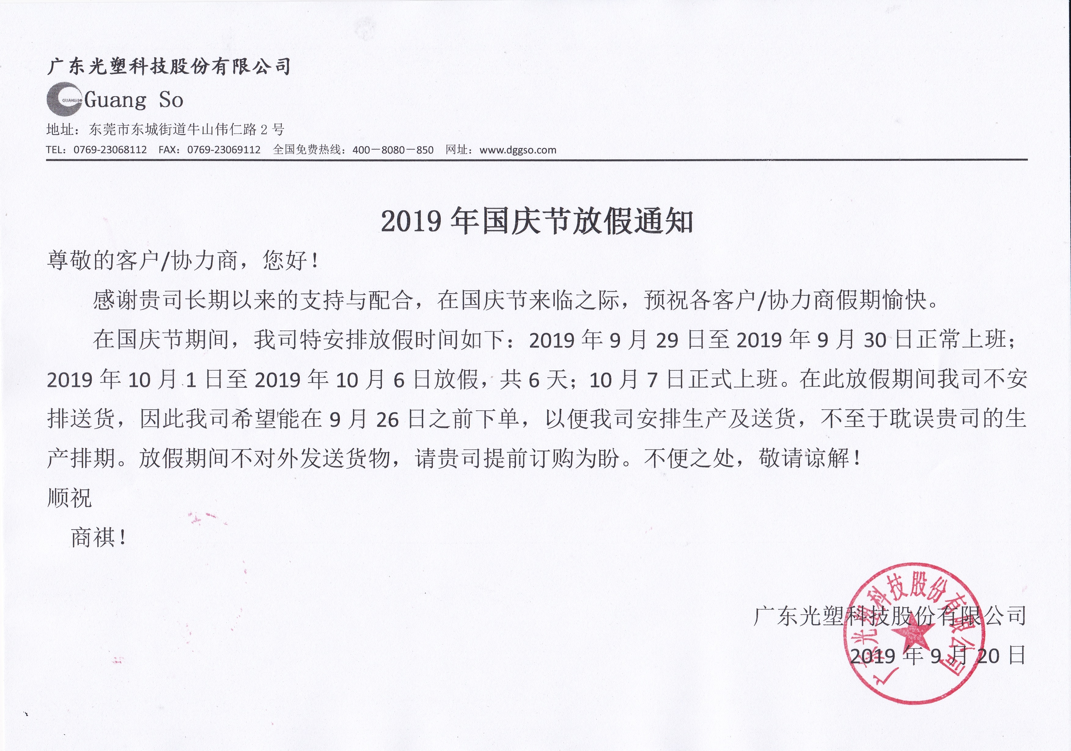 感謝貴司長期以來的支持與配合,在國慶節(jié)來臨之際,預(yù)祝各客戶/協(xié)力商假期愉快。在國慶節(jié)期間,我司特安排放假時間如下:2019年9月29日至2019年30日正常上班;2019年10月1日至2019年10月6日放假,共6天;10月7日正式上班。在此放假期間我司不安排送貨,因此我司希望能在9月26日之前下單,以便我司安排生產(chǎn)及送貨,不至于耽誤貴司的生產(chǎn)排期。放假期間不對外發(fā)送貨物,請貴司提前訂購為盼。不便之處,敬請諒解!
